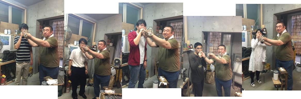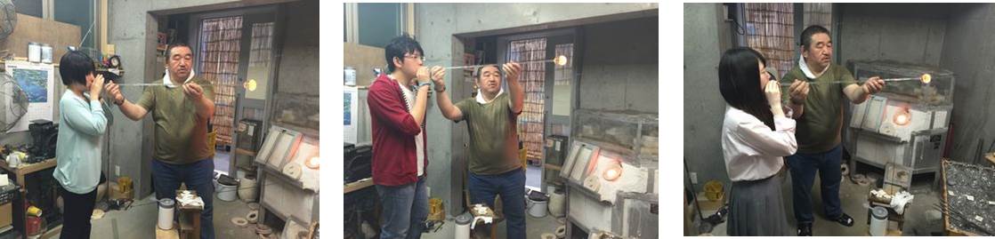 最初は、全員失敗するそうです。正義さんがおっしゃるには、ガラス吹き(宙吹き…型を使わず空中で形を整える技法)をマスターするのに10年は掛かるとのこと。初めてガラス吹きをした生徒たち。どのくらいの力で吹いたらいいのか、まったく見当もつきません。失敗作続出(笑)。でも、正義さんは「失敗を恐れちゃだめだよ。失敗したっていいんだ。物を作るということは、失敗は付き物。ただ、いい加減な気持ちで物を作ってはいけない。心を込めて真剣にもの作りをするのが職人です。気持ちは作品に伝わるもの。風鈴も心を込めて一生懸命に作れば、上手下手に関わらず良い音がするものです。そして、その風鈴は世界で一番良い音がするはずです」と。